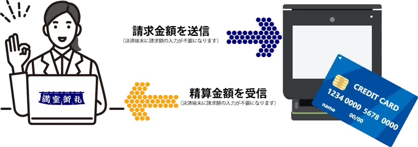 - 二度打ちの手間解消: 『満室御礼』(PMS)から決済端末へ請求額が自動で送信されるため、金額入力作業が不要になります。